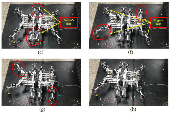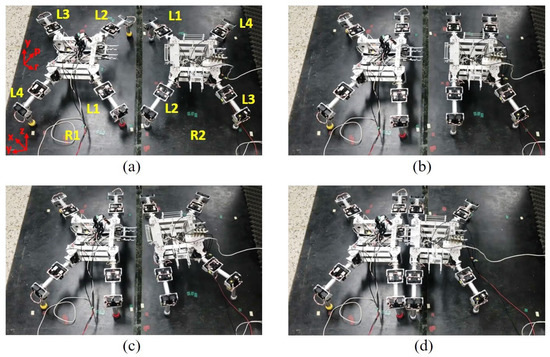 Because the coupling mechanism holds Robots 1 and 2 together face-to-face, Leg 1 of Robot 1 and Leg 2 of Robot 2 are close together and treated as the left-middle leg of the combined robot, while Leg 2 of Robot 1 and Leg 1 of Robot 2 are treated as the right-middle leg. Therefore, when combined, the robots walk according to the robot locomotion principle, in which four legs are always on the ground (with the left and right middle portions of the combined robot assumed to be one leg) to form a polygon base support, as shown in Figure 9 and Figure 10. As a result, the walking motion of the combined robot can be described as stable [21].