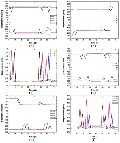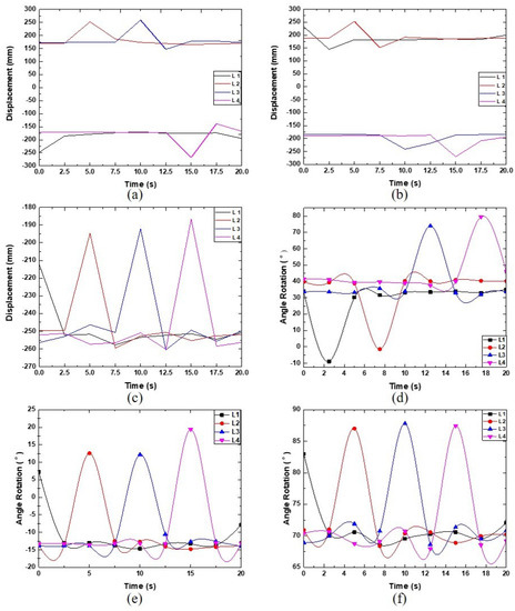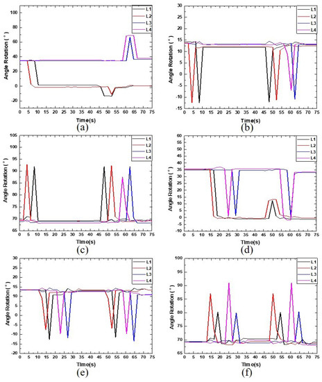 Figure 7a–c displays the foot trajectory for each leg during the walking motion of a single robot with respect to the x-, y-, and z-axes on the base frame of the robot (i.e., the center of the body). Figure 7d–f presents the rotation angle for each joint of the robot’s legs. For t = 0–2.5 s into the motion, the trajectory for Leg 1 in the x-, y-, and z-axes changes from −247.3 mm to −185.3 mm (Figure 7a), 232.6 mm to 144.6 mm (Figure 7b), and −212.5 mm to −252.2 mm (Figure 7c), respectively. At the same time, both Joints 2 and 3 of Leg 1 rotate to their maximum angle of 13.00 (Figure 7e) and 87.19 (Figure 7f), respectively, to lift Leg 1 off the ground, while Joint 1 of Leg 1 is rotated −10 (Figure 7d) to face forward (Figure 4). These results indicate that Leg 1 is walking forward and is the only leg in motion at this time.