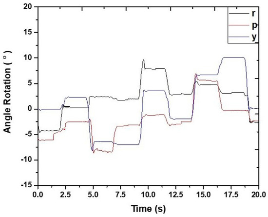 The practical validation of the stability of the single robot walking is provided in Figure 8 in the form of IMU results. These results consist of the rotational angle of the roll (r), pitch (p), and yaw (y) at the center of the robot body while walking in relation to the z-axis, the opposite of the x-axis, and the y-axis, respectively. Although there is an error caused by a delay in the response of the body center to the leg movements while walking, the overall results in Figure 8 show that no overturning occurred. At t = 20 s, which represents the end of a walking motion period, the angle of rotation along the roll and pitch axis is 2.40 and 6.25, respectively, which indicates that the body of the robot is slightly tilted toward the left and toward the back, but there is no overturning.