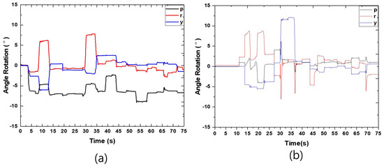 Figure 11b shows the IMU output for Robot 2, with the z-axis, the y-axis, and the x-axis representing the yaw (y), pitch (p), and roll (r) rotational axes, respectively, of the center of Robot 2’s body. The results here also support those from Figure 9 and Figure 10. For instance, from t = 12.5–17.5 s, Robot 2 experiences the same angle of rotation pattern along the roll and pitch axes as Robot 1. This is because Legs 1 and 2 are also preparing for the combining process. For t = 20–30 s, the IMU output for Robot 2 represents a pattern similar to the single walking motion, indicating that Robot 2 walks close to Robot 1 for the combination process to occur. From 30.0 to 47.5 s, Robots 1 and 2 connect together, changing the angle of rotation along with the yaw (−1.2 to 12.1), pitch (−1.3 to 6.2), and roll (−8.1 to 2.7) axes. From t = 47.5 until the end of the motion, the angle of rotation along with the yaw (between −1.8 and 0.6), pitch (between 0.5 and 2.3), and roll (between −6.1 and 2.6) axes changes, as Robot 2 walks in combination with Robot 1. The reason why there is only a small deflection while walking is because Robots 1 and 2 are held together well.