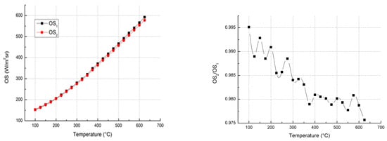 The first attempt on the use of the dual-color technique was performed with a long wavelength (LW) range camera (FLIR A655sc), equipped with two SPECTROGON filters applied through an external wheel in front of the camera [6]. On the left side of Figure 1, the object signal (OS; OS1 and OS2 represent the object signal that is the radiation captured by the IR sensor in W/m2sr) experimental trends as a temperature function is shown. Note that the OS corresponds to the Gbb,i in Equation (2), and the first notation (i.e., object signal, OS) is used to be coherent with the denomination of the parameter used by FLIR ResearchIR Max software that has been adopted in the performed measurements. The calibration phase was performed with the MIKRON black body [8] M305) up to 625 °C. On the right side of Figure 1, the SR (OS2/OS1) trend as temperature function has been also reported.