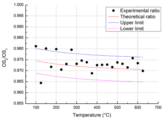 in the temperature range between 100–650 °C and OS oscillation of ±0.5 counts on the last digit of a signal of 250 W/m2Sr (T = 400 °C) was observed. Hypothesizing a temperature invariant ratio of the ΔOS/OS with temperature, the uncertainty of the signal ratio ∆SR can be obtained and the dispersion curve can consequently be represented (Figure 3).