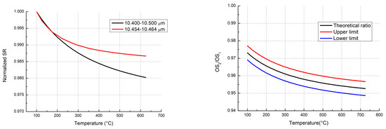 A way to reduce the dispersion related to the OS uncertainty can be achieved through the increase of the sensitivity (e.g., slope) related to the SR curve expressed as a temperature function. The two filters’ central wavelengths, in this case, have been spaced out of one order of magnitude (up to 0.1 µm). Two filters centered at 10.400 μm and 10.500 μm were considered and in Figure 4 the ratio trend is reported.