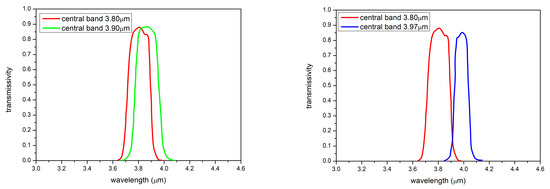Figure 6. On the (left), the 3.80–3.90 µm filters transmissivity curves are shown and, on the (right), the 3.80–3.97 µm filters transmissivity curves are shown [5,6].