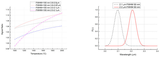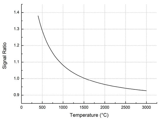 In Figure 7, on the left side, different trends of SR with temperature for different couples of filters are reported. A Gaussian form was used to replicate the filter response curves that match with typical response curves of real narrow bandpass filters available on the market. The purple curve presents a greater slope than the others. Hence, filters that work at 2.1 µm and 2.2 µm have been chosen as the best combination for the SR sensitivity. Note that Figure 7 refers to filters centered at 2.0 µm and 2.1 µm, while the final choice consists of filters centered at 2.1 µm and 2.2 µm. In order to use these kinds of filters at high temperatures, it is necessary to couple them with an attenuator. A market survey showed that it was not easy to get attenuators below 2 µm. We found most attenuators work starting from 2 µm. An attenuator working from 2 µm does not match with the left part of the filter response function centered at 2 µm, hence in order to keep the benefits of the spectral region and the same distance between the two filters (0.1 µm), we shifted the two filters ahead of 0.1 µm, considering two filters centered at 2.1–2.2 µm. They also keep the same features in terms of signal ratio sensitivity of the couple centered at 2–2.1 µm. The more the SR varies with temperature, the more it can be associated with a single temperature value. In fact, when two wavelengths are close to each other, the SR trend becomes flat with temperature and the association to a single temperature value becomes more difficult due to oscillation of the calibration curve connected to the sensitivity. On the contrary, when the filters’ central wavelengths are too far, the grey body hypothesis fails and the ratio principle cannot be used. In addition, FLIR Orion 7600 has an internal rotatable wheel (up to 100 Hz) synchronized to the acquisition system, allowing it to work in non-stationary conditions. The calibration curve obtained for the filter couple, on the right in Figure 7, is shown in Figure 8. In this case, the curve decreases since the signal ratio has been considered as OS2/OS1, while in Figure 7, it was considered as OS1/OS2, where the subscript 1 and 2 are referred to the lower and higher wavelength, respectively.