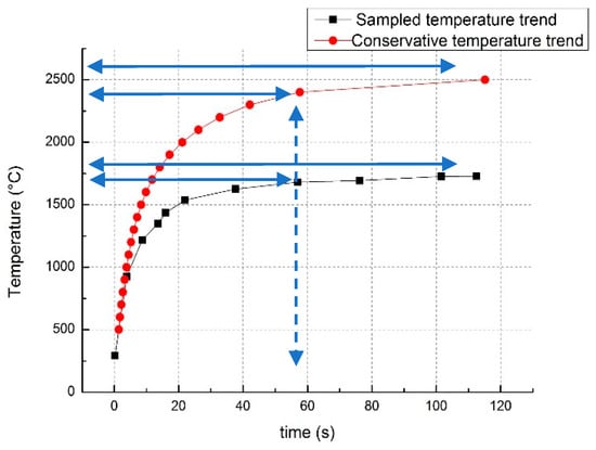 Taking a curve with black squares in Figure 9 as the reference for an experimental temperature trend versus time collected during a hypersonic test (data acquired through dual-color pyrometer), a curve (interpolating the red circles in Figure 9) with a similar shape and slope of the experimental one at higher temperature values (up to 2500 °C) has been defined in order to cover heating conservative conditions using the following analytical law: