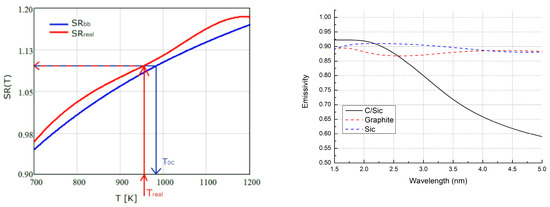 The analysis has been performed determining the SR detected by the virtual camera, with the filter indicated as F1 (2.1 µm), F2 (2.2 µm) when the object is at temperature Treal for a black body emission and using the actual material emissivity curves, associated to the same SR detected for a black body in the same camera configuration. On the left side of Figure 10 is shown a representation of the TDC process—the Treal temperature value is used to enter in the real surface SR curve for a, SRrealF1_F2(T), and the value is then used to enter into the SR for a black body SRbbF1_F2(T) and find the correspondent TDC.