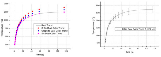 The most critical effort, however, consists in the evaluation of the accuracy due to a non-grey body hypothesis at the two adjacent wavelengths. The spectral trend of material emissivity found in the literature (right side of Figure 10) was used to make a prevision of the accuracy committed by the dual-color technique due to the non-grey body condition. Differences between the dual-color simulated results (marks) and real trend (black curve) are shown on the left of Figure 11. Percentage accuracy errors between dual-color measurement (Tdual) and real temperature value (Treal) are defined as