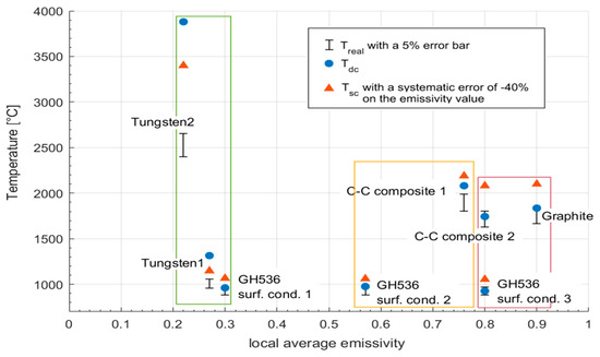 High accuracy is obtained with SiC material (0.13% at 2500 °C), and lower accuracy is obtained with C/SiC (9.3% at 2500 °C). The C/SiC curve with lower accuracy shows a trend that increases with temperature. A minimum of 3% at 500 °C and a maximum of 9.3% at 2500 °C has been revealed (right side of Figure 11). Finally, a comparison between standard thermography (single color) simulated data and dual-color simulated data for several emissivity classes of materials has been performed [7]. The results are represented in Figure 12. In particular, three classes of materials have been analysed (at low, medium, and high emissivity), enclosed in three rectangular boxes. An error band of ±5% has been associated with the real temperature, while dual-color temperature and single-color temperature (obtained with a systematic error of −40% committed over the real emissivity value) were represented by circular and triangular spots, respectively. It is possible to observe that for low emissivity materials dual-color measurements are away from the real values (they do not fall in the error band). In any case, also the single-color measurements with a systematic error are not acceptable. For medium and high emissivity classes the DC measurements fall, in the most part of cases, in the error band and they give back a better value than single-color measurements that instead fall in every case at the external of the error band.