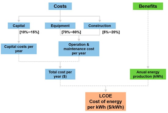 The levelized cost of energy (LCOE) is the primary metric for describing and comparing the underlying economics of power projects (Figure 1). For wind power, the LCOE represents the sum of all costs of a fully operational wind power system over the lifetime of the project with financial flows discounted to a common year. The principal components of the LCOE of wind power systems include capital costs, operation and maintenance costs and the expected annual energy production [2]. Assessing the cost of a wind power system requires a careful evaluation of all of these components over the life of the project [3]. The capital costs, which account for 10–15% of the total project cost, include all expenses incurred in the purchase of land, buildings, construction and equipment. Equipment is worth between 70% and 80% of the total project cost, mainly due to the cost of the turbine. Construction is worth around 5% to 20% of the total project investment. The operation and maintenance (O&M) cost is the cost associated with the operation and maintenance of a wind farm.