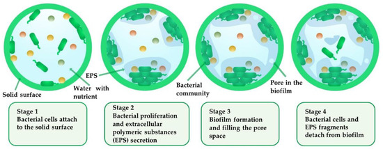 The morphology and structure of biofilms as well as the factors influencing the structure of biofilms in fluid have been widely studied. The interaction of fluid hydrodynamics and mass transport contributes to the diverse heterogeneous structure of biofilms. Biofilm development is a dynamic process that involves the surface adsorption and proliferation of microbes, the secretion of EPS, and the partial desorption of biofilms into the fluid [2,21,22]. Under an environment that suffers from shear force, detachment of bacterial cells and EPS fragments occurs during each process. The processes are more complicated when biofilms develop on a surface in a porous aqueous environment due to the complexity of pore networks in porous media and the variety of pores sizes and shapes within porous media. The related processes of biofilm evolution in a pore are split into four main stages as shown in the schematic in Figure 1.