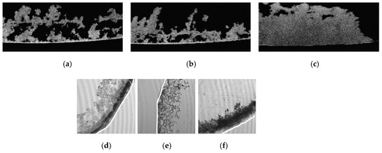 Within the last decade, to divide the biofilm from bulk fluid, researchers have made progress towards determine contrast agents suitable for biofilm imaging in porous media [20,54,55,56,57]. Iltis et al. [54] first used hollow silver-coated microspheres as a contrast agent to generate realistic 3D representations of biofilm grown in a glass bead pack. They further tried other contrast agents—a mixture of micrometer-sized barium sulfate and potassium iodide—to visualize the biofilms in polyamide and expanded-polystyrene-beads-modeled porous media [55]. The images are restricted to the external structure of biofilm since the agent particles have full coverage over the biofilm surface. Nevertheless, the obtained 3D images of biofilm structure may provide new ideas and experimental bases for studying the heterogeneity of mass transport and pore space caused by biomass growth. 1-Chloronaphtalene was used as a contrast agent to prevent the drawbacks of classical agents, such as fast sedimentation and heterogeneous distribution [20]. Characteristics (for example, partial pore clogging), especially at the sites of nutrient entry, can be observed by imaging experiment. A quantitative analysis on the microstructure (volume fractions and specific surface area) of the biofilm developed in columns of clay beads is also proposed based on the 3D images obtained in that study. The methods mentioned above share another trait in that the agents are potentially destructive to the biofilm morphology. Accordingly, iron sulfate (FeSO4) was chosen as a nontoxic inorganic compound and added to the feed solution during biofilm growth [56]. In the contrasting experiment, barium sulfate was used, and more than 50% of biofilms were washed out due to abrasion and shear detachment, emphasizing the importance of nondestructive contrast agents (Figure 3). The oxidation of Fe (II) to Fe (III), which is less soluble and tends to form colloids, was observed quickly after the startup of the system, complicating the biofilm-filled system.