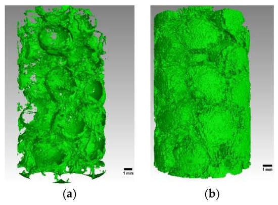 X-ray tomography images for biofilm structures in pore space with two types of contrast agents (a) barium sulfate and (b) iron sulfate. The obtained volumetric fraction of biofilms (green area) is much smaller by using barium sulfate as a contrast agent due to the long injection time.