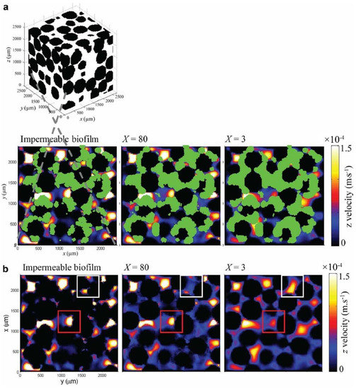 After 27 h development of biomass, velocity maps at slice z = 600 μm for impermeable biofilms (X = ∞) and permeable biofilms (X = 80 and X = 3) are shown in (a) with biomass (green areas) and (b) biomass omitted, (reproduced with permission from [105], Copyright John Wiley and Sons, 2012).