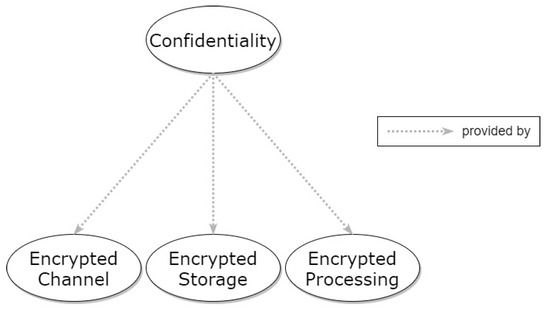 Formal definitions of Confidentiality are typically based on the concept of information flow (IF) [30], separating users in classes with different access rights to the system’s information and distinguishing the information flows within the system according to the user classes to which they should be accessible. Herein, Confidentiality is considered a property that refers to a high-level problem and, thus, depends on specific patterns to solve lower-level problems, creating the context for them. The relationships of Confidentiality with the specific patterns are depicted in Figure 2. Three core patterns have been identified for achieving Confidentiality: Encrypted Channel, Encrypted Storage, and Encrypted Processing, respectively covering all data states, i.e., data in transit, data at rest, and data in processing, respectively.