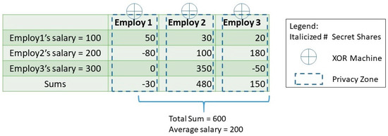 Practical implementations of the Encrypted Processing pattern are mainly based on the use of homomorphic functions [31,32] and secure multi-party computation (SMC) [33,34]. The latter takes advantage of additive secret sharing, which refers to the division of a secret and its distribution among a group of independent, willing participants. As an example, let us consider a scenario where three employees want to calculate their average salary without revealing each person’s own salary. Figure 5 depicts how the salary of each employee is randomly split into three pieces (secret shares) and distributed to the three employees. Therefore, the sums of the corresponding pieces allow the calculation of the total sum and the average salary, without disclosing any useful information about each employee’s salary.
