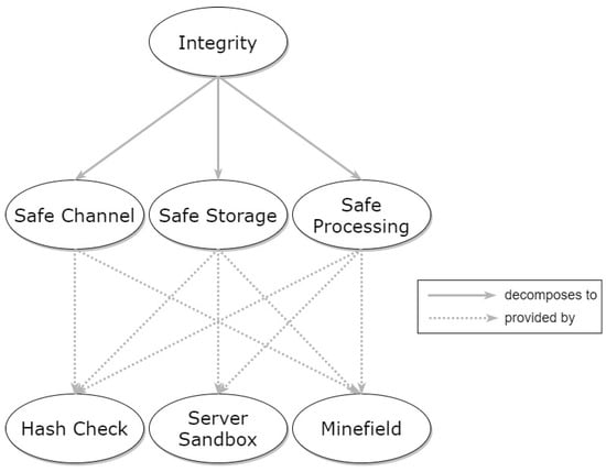 Integrity, as was the case for Confidentiality, is considered a property that refers to a high-level, complex problem, thus creating the context for more specific patterns. The relationships of Integrity with the specific patterns are depicted in the graph of Figure 6. Three high-level patterns (Safe Channel, Safe Storage, and Safe Processing) can be utilized for achieving integrity and three lower-level patterns can be used for the implementation of the above, as sketched in the figure.