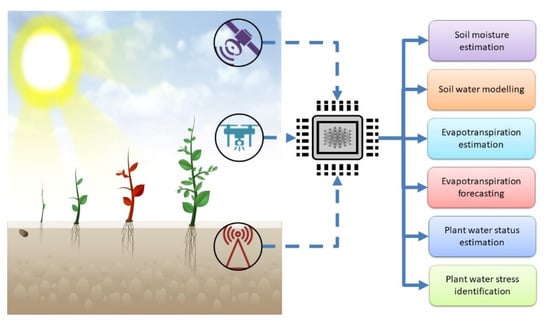 Advances in sensing technologies have truly revolutionized the methods for plant water stress assessment as illustrated in Figure 1, allowing rapid, automated and cost-efficient soil-plant ecophysiology monitoring [16]. These days, environmental sensors have become inexpensive owing to the popularity of IoT devices that can measure agricultural data in real-time. Various state-of-the-art remote sensing (RS) techniques have also been introduced for fast and non-invasive plant water status estimation [17]. Alvino and Marino [18] have reported in the recent literature on several RS approaches for plant water stress assessment in the cultivated environment for irrigation management. Numerous platforms and sensor types have been used providing unlimited heterogenous data, analysed using a range of modelling approaches.
