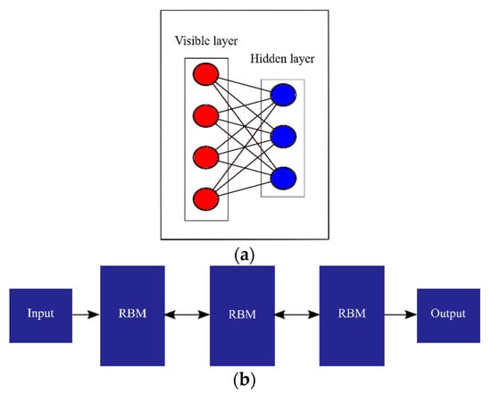 The deep belief network (DBN) is arguably the first successfully trained DL model. The architecture is constructed of stacked Restricted Boltzmann Machines (RBMs) [46]. A single RBM is an energy-based probabilistic generative model that consists of two connected layers, visible and hidden, with no connections within a layer. The hidden layers are regarded as higher-order features that capture the characteristics of the input data. In multi-layer DBN, the output of the preceding RBM is used as input for the following RBM (Figure 2) allowing for deeper feature extraction and dimension reduction. The training process is done in two steps: firstly, initializing the proper deep network weights by utilizing an efficient unsupervised fast greedy learning strategy; then the final fine-tuning of weights takes place in a supervised manner through Back Propagation, with the addition of a linear classifier on the top layer of the DBN.