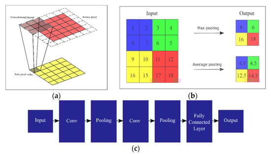 Deep convolutional neural network training architecture. (a) Description of convolutional process using kernel on two-dimensional input source; (b) Description of maximum and average pooling process; (c) Basic deep Convolutional Neural Network (CNN) structure typically consisting of multiple convolutional and pooling layers with a fully connected layer at the end before output.