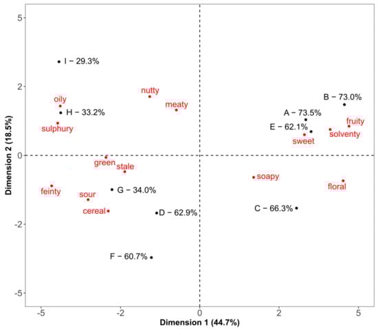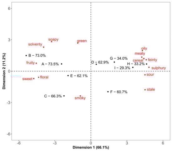 Dimension 1 separated fruity, sweet, floral, soapy and solventy spirits (positive end) from sulphury, feinty, stale, cereal and sour spirits (negative end). As observed in the QDA data (Section 3.1), this related to the ABV of the spirits. Again, as detected by QDA, the intermediate spirits did not fully follow this trend. While they were all located between the high and low ABV spirits, spirit E was located closer to the high ABV spirits and D and F close to the low ABV spirits.