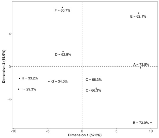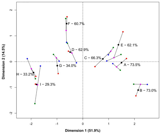 Results of the HMFA of the three data sets is shown in Figure 6. The first two dimensions of this analysis accounted for a total of 66.4% of the total variance. The grouping of the spirits across these dimensions show that all three methods largely discriminated between the spirits in the same way. This was further confirmed by comparing the RV scores (Table 2). High RV scores between methods mean that they produce similar product maps, with an RV > 0.8 considered as similar [43,44]. The RV scores in this study were all around 0.9. Some differences could be observed, however. For example, there were bigger differences between the QDA and Napping data for the lowest ABV spirits (H and I), than for the highest ABV spirits (A and B). Napping differentiated less between the spirits than QDA and GC-MS, resulting in the same product maps with a lower resolution for finer differences. GC-MS appeared to differentiate the high ABV spirits better, while the resolution for the low ABV spirits was better using QDA.