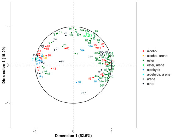 GC-MS identified a total of 96 compounds in the spirits. A full list of the detected compounds, their typical aroma descriptors, chemical group, and the peak area in each of the spirits can be found in Table A2 (Appendix A). PCA of the peak area data is shown in Figure 4 and Figure 5. The first two dimensions accounted for 71.6% of the variance in the data.