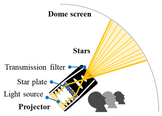 There are two types of projection systems that produce images in a planetarium: optical and digital. Owing to the resolution and color tone limitations of digital projectors, it is difficult to reproduce a detailed Milky Way with sufficient resolution to evaluate image faithfulness. Therefore, in our experiment, a planetarium with an optical system using star plates was used to reproduce fixed stars, nebulas, and the Milky Way, as shown in Figure 1. Stars were projected on the dome screen by passing light through the star plates installed in the projector. The direct luminance of the stars was adjusted by inserting transmission filters in front of the light sources. The representation size and star density were controlled by the diameter of the hole and the number of stars in the star plates, respectively. Therefore, we defined the three parameters (transmittance, representation size and star density) of individual stars.