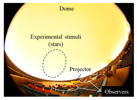 Figure 2 presents the projected experimental stimulus prepared as the standard pattern. The projection size of stars in the stable stimulus was determined by the magnitude class, and the stars were projected in a viewing angle range of 0.2′ to 4′ from the viewing position of the observers, as shown in Figure 2b. The hole diameter sizes of the star plates were designed considering all projection conditions, including the intensity of the light source, design filter, and optical conditions. The size of each star in the variable stimulus was the same (an approximately 2-μm hole) because of the processing limit for metal plates. Furthermore, the size of projected stars in the variable stimulus was less than 0.2′ of the viewing angle. The standard parameters of physical factors such as luminance, representation size and star density were set as approximately 1.91 cd/m2 at the dome screen surface (luminance) with a viewing angle of 0.2′ in diameter (size) of each individual star which was projected from a projector with a star plate.