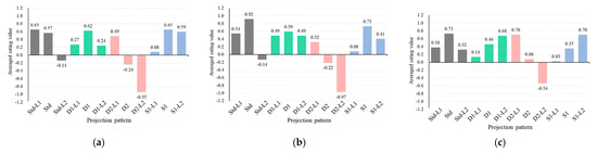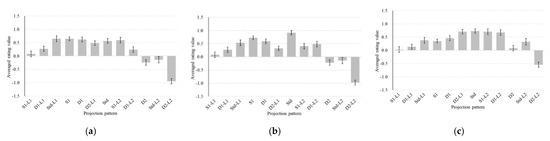 Evaluation results for all observers for each projection pattern in luminance order. (a) Faithfulness; (b) Preference; (c) Depth feeling.