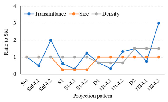 The physical factors of transmittance, representation size and star density of the standard pattern were normalized as ( to integrate the changes for each factor. According to their ratios to another pattern, the transmittance component was calculated by using the total area of holes on the star plate because one of the standard patterns had a value of 1.0. The representation size and star density components were derived from the changes in the physical values. Figure 6 shows a summary of each component for each projection pattern. For example, in the case of pattern S1-L1, we obtained three components = (0.5, 0.25, 1) because the pattern S1-L1 had half transmittance, a 1/4 area ratio, and the same density as the standard pattern. By using these physical components to represent the characteristics of each projection pattern, we constructed a common model to estimate the psychometric evaluation values for faithfulness, preference, and depth feeling.
