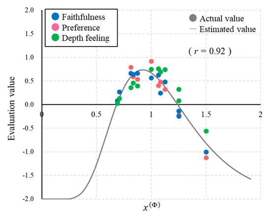 where and represent the mean and standard deviation of the natural logarithm of the variable for evaluation index . represents the scaling factor for the evaluation index . By least-mean-square fitting, as shown in Figure 8, they were calculated as shown in Table 3. Here, the fittest weights (, , ) and w were (0.26, 0.27, 0.47) and 129.93 for faithfulness, (0.26, 0.23, 0.52) and 129.31 for preference, and (0.23, 0.25, 0.52) and 130.08 for depth feeling, respectively. The correlation coefficients for each evaluation index improved to 0.98, 0.97, and 0.94. This fitting model for each evaluation index fulfills a condition for reproducing an outstanding appearance with faithfulness, preference, or depth feeling as desired by observers in a planetarium.