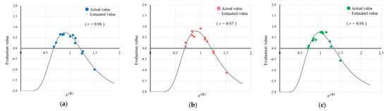 Fitting results for each evaluation index by proposed estimation model. (a) Faithfulness; (b) Preference; (c) Depth feeling.
