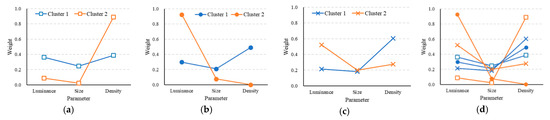 Weights in two clusters for each evaluation. (a) Faithfulness; (b) Preference; (c) Depth feeling; (d) Total comparison.