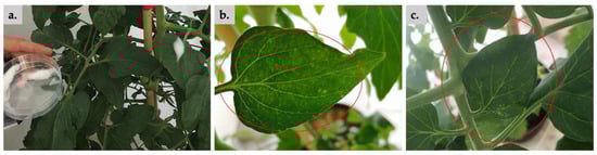 Plant infestation with spider mites. Panel (a) illustrates the process of infestation where each plant was inoculated with 30 mobile stage of spider mites put on a cotton pad that was attached on the leaves. Panels (b,c) show the appearance of infested tomato leaves when the plants presented strong stress related to the infestation.