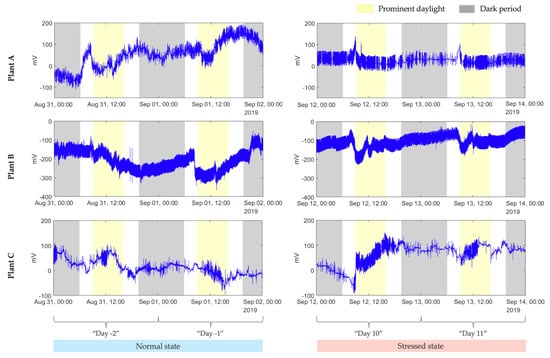The study aims to build a model that distinguishes the normal from the stressed plant state caused by a spider mite infestation. Therefore, we chose to work with fragments of the signal of 2 days recorded before the contamination (“Day -2” and “Day -1”) and with another fragment of the same length taken before applying the phytosanitary treatment (“Day 10” and “Day 11”), from each of the 12 selected, infested plants, respectively. More precisely, the final dataset included, in total, 48 days of recordings acquired from the 12 plants, where half represented the electrophysiological signal in a normal plant state, and the other half were in a stressed state. The signals recorded from three plants that were enclosed in the taken dataset are shown in Figure 3.