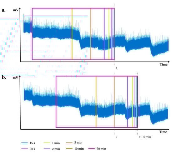 Schematic representation of the windowing procedure. At time point t (panel (a)) seven intervals of different lengths are taken from the signal, namely the last 15 s, 30 s, 1 min, 2 min, 5 min, 10 min and 30 min. Once the features are calculated for all of these seven windows, we move forward in a step of 5 min (panel (b)), where we take seven new intervals of the recorded signal with the same lengths as in the previous step. This procedure is repeated to cover the entire duration of the signal recording.