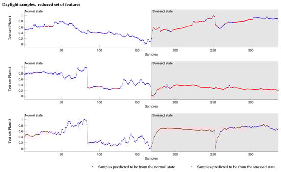 Predicted class of each sample forming the test set used to evaluate the model obtained when analyzing the daylight samples subset with the reduced set of features. The color of the samples indicates the class that has been attributed to them by the classification model—blue represents the normal, whereas red is the stressed state. For each plant, the plotted samples overlay the normalized feature mean value of the signal calculated for a window of 5 min.