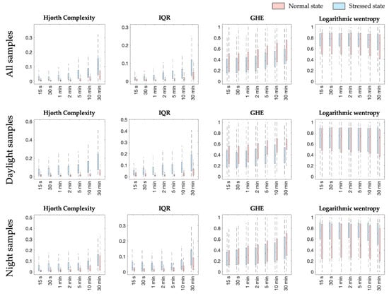 Overall, from the summary given in Table 2, one could observe that the Hjorth complexity at 5 min, IQR at 2 min and GHE at 30 min appeared as the most discriminative features. The logarithmic wentropy at 15 s appeared as an important feature for the discrimination of the plant status only when the night samples were used. Figure 6 shows the distributions without outliers of these four features for each sample subset and each window length. Hjorth complexity presented differences in distribution between the normal and the stressed state for all three sample sets and all window lengths. However, the distinction between these distributions was most notable for daylight samples, mainly for window lengths between 1 and 30 min. In the case of night samples, the Hjorth complexity distributions were notably closer. Similar findings as the Hjorth complexity feature could also be observed from the distributions of IQR. Considering GHE, distribution dissimilarities were mainly observed for the samples acquired during daylight, with most notable distinction for windows of 30 min. In line with the obtained modeling results, the logarithmic wentropy portrayed notable differences in distribution mainly for the set of night samples. For the daylight samples, these differences were very small.