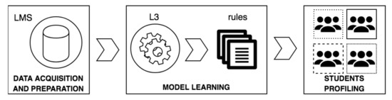 - Data acquisition and preparation: Student-related data are acquired over the whole academic year by the Learning Management Systems (LMS) adopted by the university, collected into a unified repository, and prepared for the classification process.