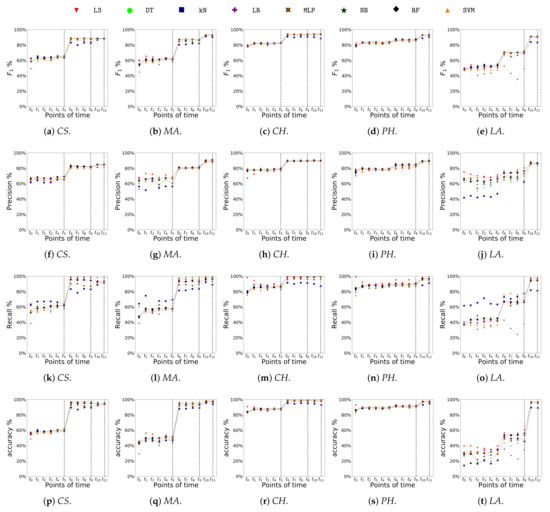 Extracting association rules allows us to explore the most relevant item co-occurrences relative to different feature combinations [40]. Figure 5 shows the importance of a subset of relevant combinations of feature for LA at different time points. For example, the scholar history (HS-loc, HS-gr) is relevant to predict success rate before any university activity (i.e., before ), including entry test and BS course choice. After that, and until almost the end of the semester (), the high school grade and the entry test grade coupled with the BS course choice (HS-gr, BS course), (GRE-gr, BS course) became the most relevant feature combination. During the first semester (from to ) educational material download of two courses has the strongest effect (MA-mat, CS-mat), showing student active participation. Finally, during the second semester (when LA is given), the most relevant feature combination is the number of downloads of educational material combined with the grade achieved for the MA course (LA-mat, MA-gr).
