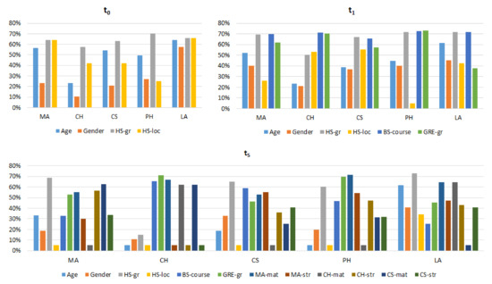 Figure 3 shows the percentage of rules including specific features in their antecedent at three representative time points: (before the entry test), (after the entry test and the BS course choice, but before the start of the semester) and (at the end of the first semester). The plot highlights the features that mostly influence student performance separately for each course and time point. At only the student-specific features are considered and, unsurprisingly, the most important one is the high school grade (HS-gr). Age turned to be strongly correlated with the success rate as well, because students who are older than average often achieved bad results during high school. At the entry test grade (GRE-gr) plays a significant role in rate prediction, in combination with HS-gr. The BS course choice (e.g., mechanical engineering vs computer science engineering) is also an important feature, because the attitude of the students towards the different disciplines depends on the perceived importance in their future. At the effect of the download of educational material (e.g., MA-mat) and of the streaming activity (e.g., MA-str) for the different courses are visible. The high school degree remains very relevant, while in general age decreases its importance. The activities carried out in one course may influence other courses. For example, since MA provides students with the basic concepts for both LA and PH, the exam grade (whenever available) is particularly discriminating.