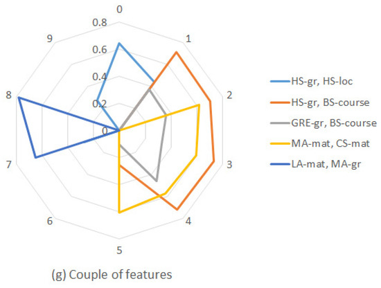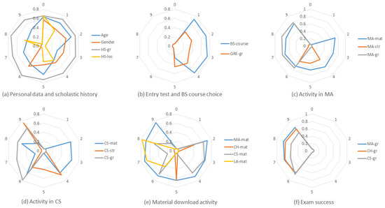 The radar plots in Figure 4 deepen the feature analysis for the 2nd-semester LA course. Features are grouped in different categories (personal data and scholastic history, entry test and BS course choice, activity in two sample courses, MA and CS, educational material download and exam success) and their importance is compared at all the time points (from 0 to 9). For example, graph (a) confirms that the high school grade (HS-gr) has an important impact on student performance during the whole academic year. On the contrary, gender is relevant only at the beginning, because the student activity during the semester becomes more and more important to foresee exam success rate. Graph (b) shows that the test grade (GRE-gr) and the BS course choice have an impact only in the first semester, and during the second semester (when the LA course is on) other features become much more important. Graph (c), about students’ activity in the MA course, shows that studying MA is strongly related to passing the LA exam. It also evidences that the streaming activity (MA-str) is mainly relevant at the end of the semester and during the exam break: students use educational materials from the beginning of the semester, but concentrate the streaming activity closer to exam sessions. Graph (e) shows that passing the 1st-semester exams (MA-gr, CH-gr, CS-gr) has a strong influence on passing LA in the second semester (the influence is higher in case of MA than CS, coherently with the topic focus). The performance in the first semester of the first year is probably the most discriminating factor in classifying students as active or inactive.