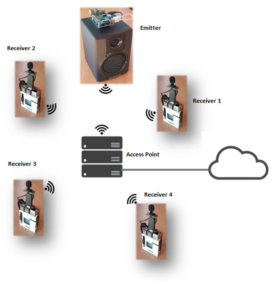 To develop the aforementioned applications, we have used a WASN with 5 nodes based on the Raspberry Pi 3b (RPi) board, 4 for registration and one for emission, according to Figure 2. This platform is based on the Broadcom BCM2837 system on chip, which includes a 1.2 GHz quad-core ARM Cortex-A53 processor, with 512 KB of shared L2 cache, a VideoCore IV graphics processing unit (GPU) at 400 MHz clock frequency, with built-in WiFi (IEEE 802.11 b/g/n standard) and Bluetooth and 1 GB of LPDDR2 RAM at 900 MHz, with a micro-SD card memory. We installed in the measurement nodes an Andoer B01LCIGY8U-USB condenser microphone, with omnidirectional reception pattern, sensitivity = dB, SNR > 36 dB and linear frequency response between 20 Hz and 16 KHz.