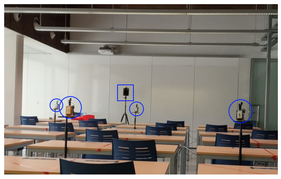Figure 3 shows the classroom prepared for measurement. As shown in Figure 2, the measurement system comprises the registration nodes and the broadcast nodes configured, with a NTP server configured to have the same time in all the nodes, from a central computer, which acts as a server. The synchronizing order is sent to the player node (with loudspeaker) to start playing the excitation signal and to the recorder nodes to start recording at the same time. In the case of playback, it is possible to play both a frequency sweep that will allow the extraction of the IR of the room and subsequent calculation of different parameters, and different speech signals, which will allow the direct calculation of the SII at the position of each node. Once the recording is finished, the audios are sent to the central equipment which is in charge of storing them along with the positions of each node and making the pertinent computations.
