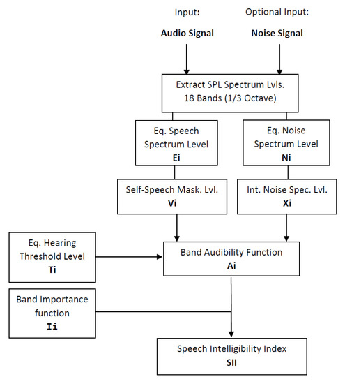 - American National Standards Institute; Acoustical Society of America. Standards Secretariat. American National Standard: Methods for Calculation of the Speech Intelligibility Index; American National Standards Institute: New York, NY, USA, 1998. [Google Scholar]