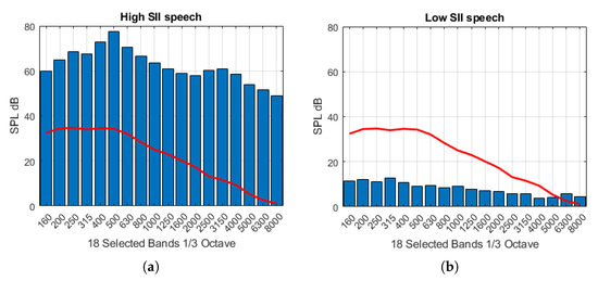 Focusing on SII, we have developed the algorithm following the norm ANSI S3.5-1997. We sampled at 44.1 KHz and from the total audible spectrum of 30 bands in 1/3 octave, we selected the 18 bands specified by the ANSI standard. These bands, as we can see in Figure 6, cover on the frequency content of the human voice and are between 160 and 8000 Hz. The results shown in this Figure describe two examples with high and low SII, taking into account the intelligibility scale from Table 2.