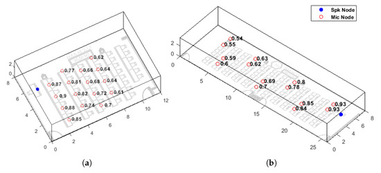 3D models and SII measurement mappings in different rooms at the ETSE ((a). Classroom 2.1.1 and (b). Classroom 1.0.1). Marked positions of sound source node (blue dot) and receiver nodes (black circles).