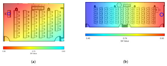 Heat-maps of SII measurement mappings in different rooms at the ETSE ((a). Classroom 2.1.1 and (b). Classroom 1.0.1). Marked position of sound source node (blue cicle).