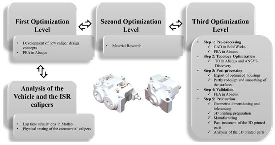 At the beginning of this research, the identification of mass reduction possibilities was implemented. For this reason, an analysis of the vehicle’s braking behavior, together with the ISR calipers, was conducted. Then, the calipers were optimized using a three-level optimization procedure in order to reduce their weight, and thus the total unsprung mass of the racecar. A reduction of the vehicle’s unsprung mass could improve its performance. The implemented methodology is depicted in